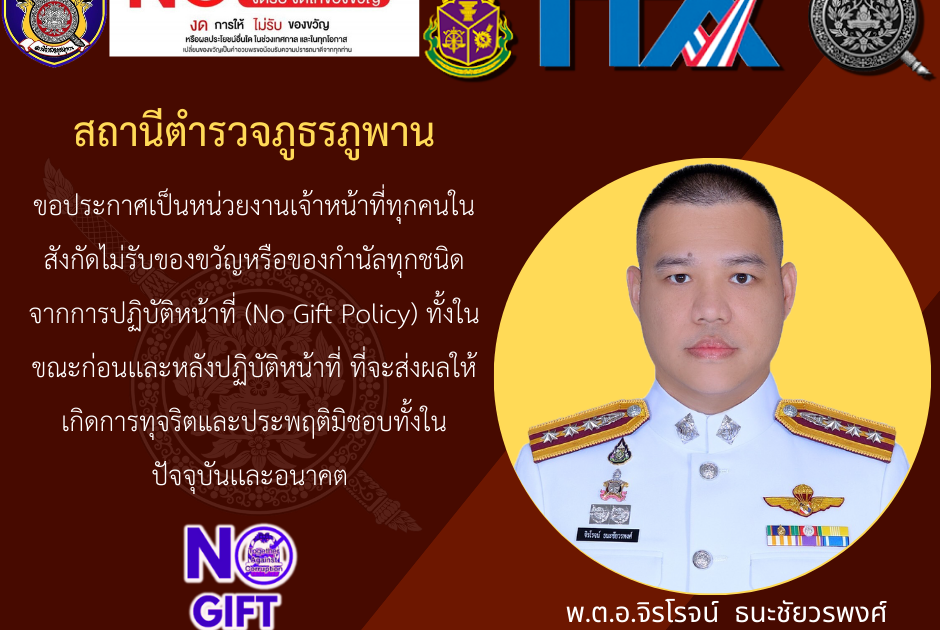 เมื่อวันที่ 18 มกราคม 2568 เวลา 10.00 น.พ.ต.อ.จิรโรจน์ ธนะชัยวรพงศ์ ผกก.สภ.ภูพาน พร้อมข้าราชการตำรวจในสังกัด ร่วมประกาศเจตนารมณ์ที่จะไม่รับของขวัญและของกำนัลทุกชนิดจากการปฏิบัติหน้าที่ (No Gift Policy)